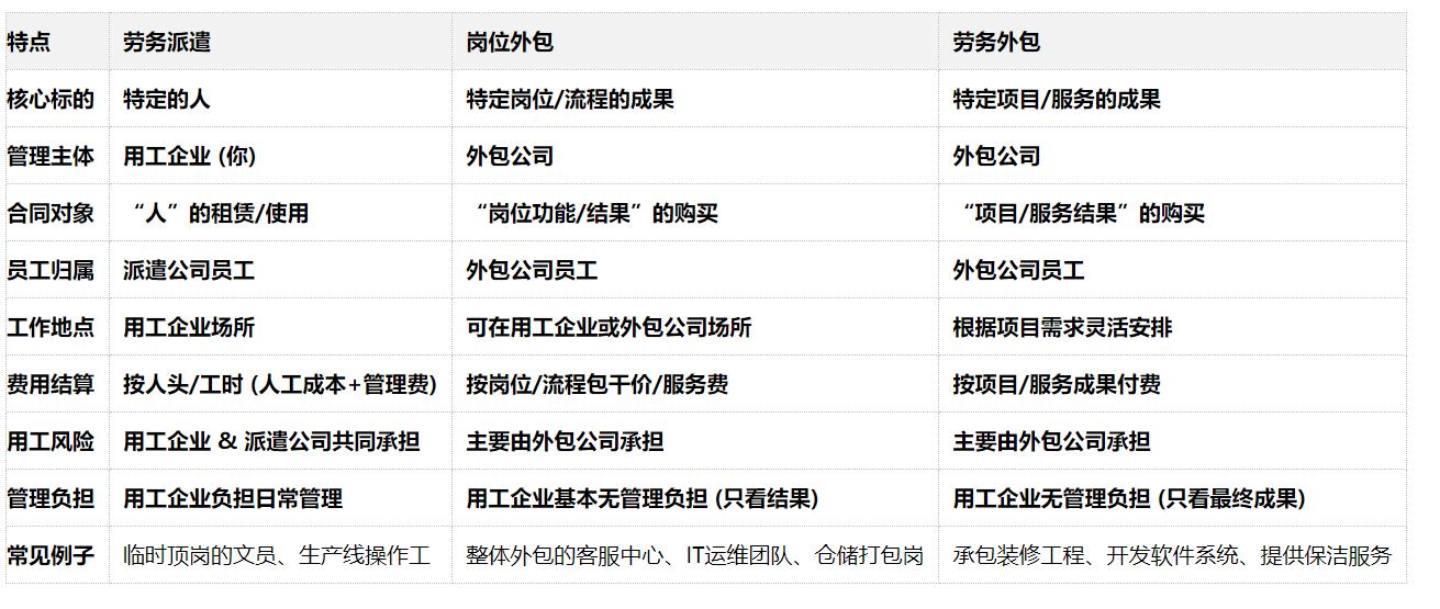 与劳务派遣的根本区别:管理权和风险归属是劳务派遣与外包(岗位外包/劳务外包)的核心分水岭。派遣模式下,企业管人担责;外包模式下,外包公司管人担责,企业买结果。